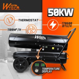 Il diffuse un bon flux dair chaud grâce à une puissance de chauffe de 50 KW et un débit dair de 1100 m³/ h.