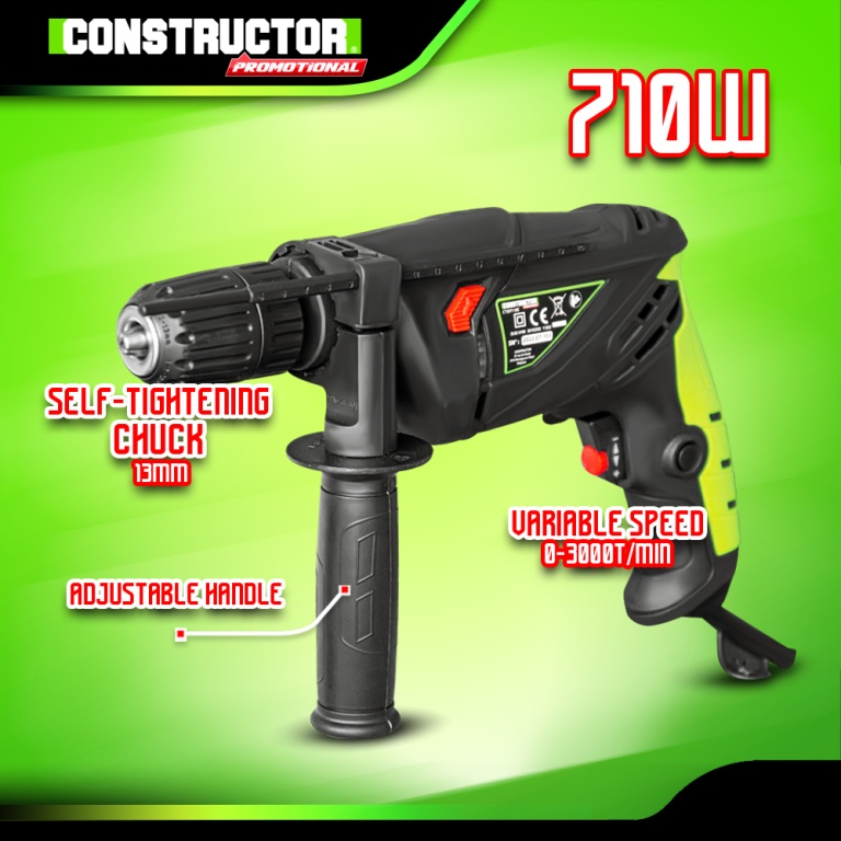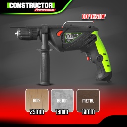 Marque:CONSTRUCTOR PROMOTIONALGarantie:2 ansDescription:Avec cette perceuse percussion de la marque Constructor Promotional, vous pourrez percer votre trou en un rien de temps.Soit en choisissant la fonction perçage ou perçage avec percussion selon le matériau à percer.Elle est fournie avec une butée de profondeur qui vous permettra de forer à la profondeur désirée.CaractéristiquesPuissance : 710WVitesse variable : 0-3000 t/minMandrin autoserrant 13mmCapacité de perçage : bois 25mm, métal 10mm, béton 13mmLongueur du câble électrique : environ 1.75MPoids : 1.75kgGarantie : 2 ansCode EAN/GLN:5411074231606Poids:1.90 kg