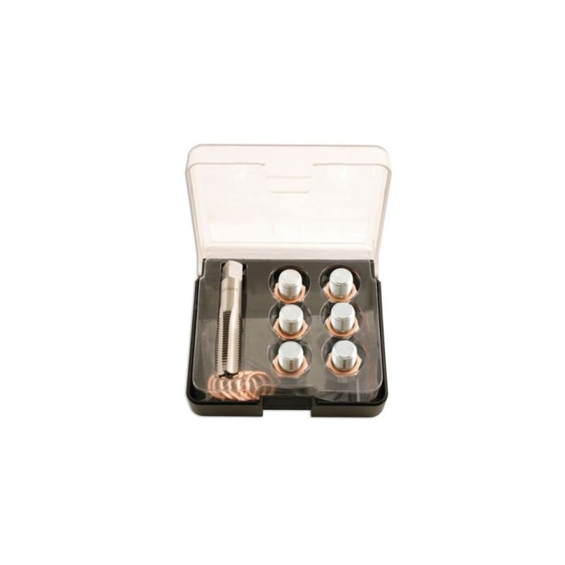 Kit de réparation de carter d'huile M15 X 1.5 Utilisation sur les carters d'huile avec un filetage endommagé Contient 1 filière M15 x 1.5 - 6 vis de carter et 12 rondelles en cuivre Partie du programme de 6 différentes tailles allant de M13 à M22 A utiliser sur les carters en M14 lorsque le filetage a été endommagé Fabriqué en acier sélectionné