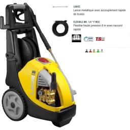 Nettoyeur haute pression pro, pourvu d'un moteur 4 pôles délivrant 1450 tr/min avec protection thermique- Pompe linéaire avec 3 pistons céramique, tête de pompe en laiton avec vanne by-pass incorporée- Le clapet d'aspiration et refoulement est en acier inox- Reservoir detergent pour aspiration indirect- Régulateur de pression avec manomètre à bain de glycerine- Support accessoire et flexible, poignée ergonomique- Pression 130/150 bar- Débit 660l/h- Puissance 2900w- Temp entrée eau max 40C°- Dimensions 59x37x87cm / 28kg- Motopompe MP3- Modèle avec enrouleur flexible