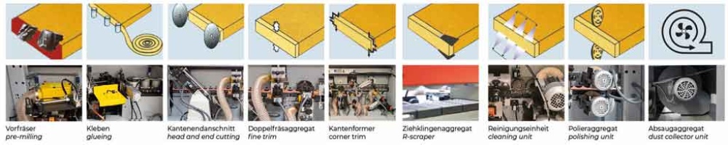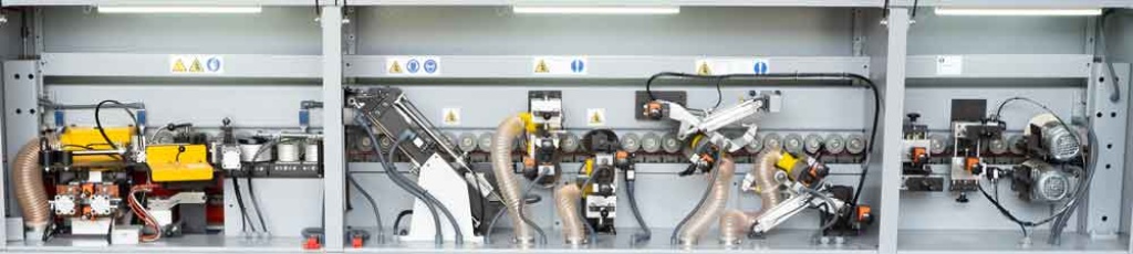 Plaqueuse de chants automatique équipée dun écran tactile.Placage uniquement sur la face intérieure.Application directe de la colle sur le panneau.Toupie dentrée, avec tête double Ø 50 mm, rotation gauche/droite, avec 2 moteurs indépendants de 1,5 kW chacun, et 12000 min-1.