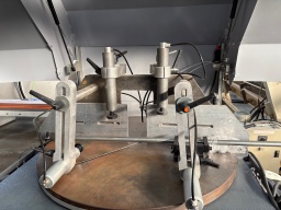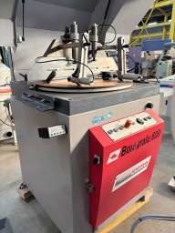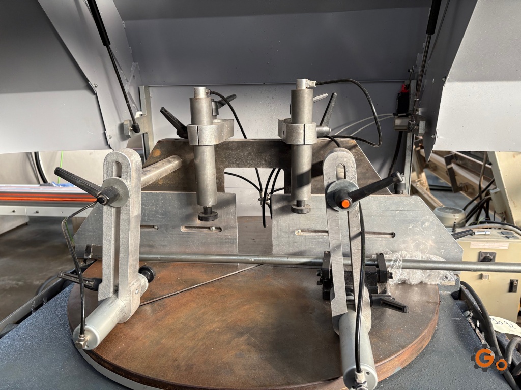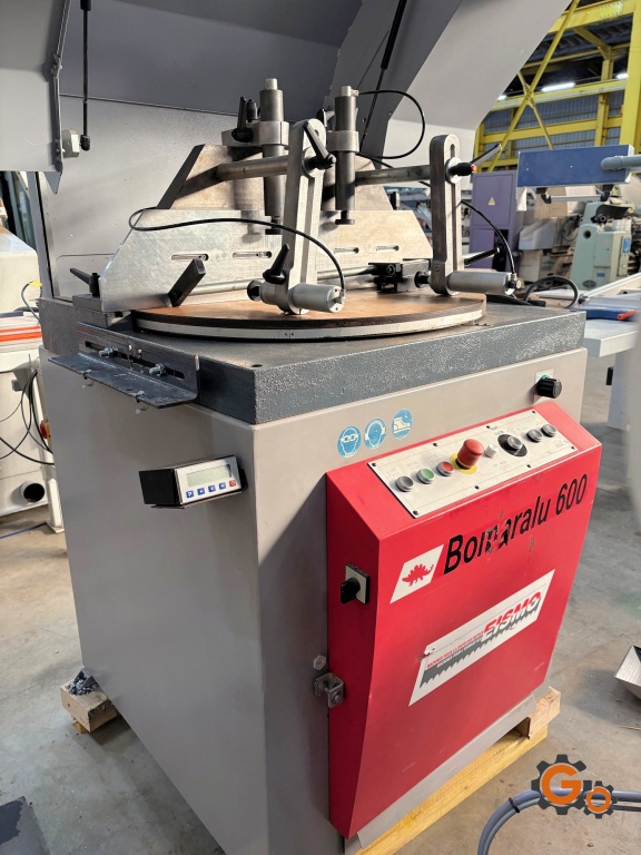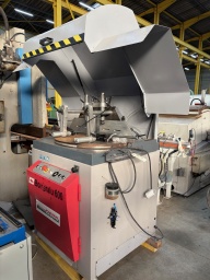 Tronçonneuse à lame ascendante,Pour coupes droites et biaises : -30°/90°25° par rotation du plateau,Lame Ø 600 mm, 2 vérins verticaux, Moteur : 5,5 kW,avec 2 trains de rouleaux de 2 m