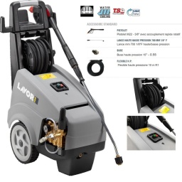 Nettoyeur haute pression pro,Moteur électrique 4 pôles 1450 tr/min avec protection thermique et refroidissement à eauPompe linéaire 3 pistons céramique, tête de pompe en laiton avec vanne by-pass incorporéeClapets aspiration / refoulement acier inoxT.S basse tension et arrêt total temporiséAspiration du détergent evac reservoir intègré 2,8LRégulateur de pressionManomètre à bain de glycérineSupport d’accessoiresPoignée ergonomiqueAvec enrouleur- Pression 200 bar- Débit 1260l/h- Puissance 9400w 400v- Dimensions 61x40x91cm / 70kg- Motopompe MPW5 / 1450RPM