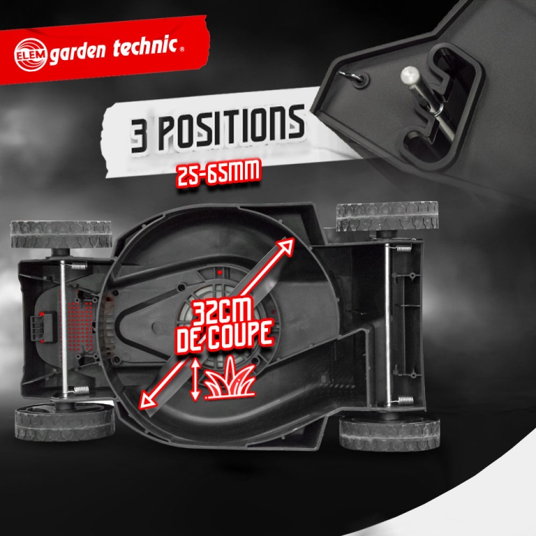 Elle dispose dune double sécurité avec un bouton ainsi quune gâchette de puissance à activer lors du démarrage.Pour garder un résultat parfait durant de nombreuses années, la lame en acier se démonte et saffûte facilementCaractéristiques :- Puissance : 1300 W- Largeur de travail : 32 cm- Vitesse: 3450 t/min- Réglage hauteur de coupe: manuel 3 positions 25-65 mm- Type de carter : Polypropylène - Capacité du bac récolteur: 25 L - Double sécurité : bouton à enclencher gâchette de puissance- Lame en acier démontable et affutable- Grande poignée centrale pour un transport aisé- Guidon pliable rapidement, pratique pour le transport et lentreposage