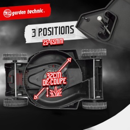 Conçue pour la tonte parfaite de votre jardin, elle possède une largeur de travail de 32 cm ainsi quune hauteur de coupe réglable sur 3 positions.