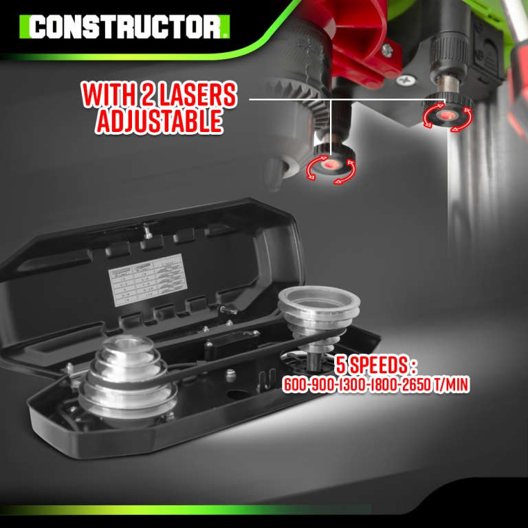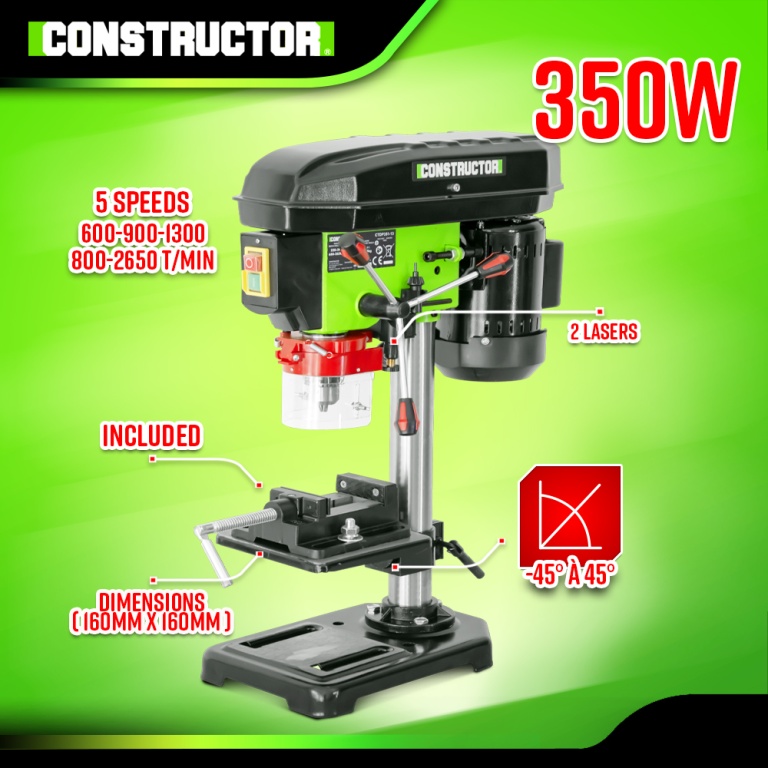 Marque:CONSTRUCTORGarantie:5 ansDescription:Grâce à cette perceuse à colonne, vous pouvez percer du bois, du métal ou tous types de plastique...votre travail sera facilité par létau qui est fourni.Elle possède 5 vitesses 600 - 900 - 1300 - 1800 - 2650t/min pour vous adapter aux différents matériaux à travaillerTable inclinable de -45 à 45° : idéal pour les perçages de biais.Le réglage de la hauteur seffectue grâce à une crémaillère à manivelle.Ce produit est garanti 5 ans.Caractéristiques :- Puissance: 350W- Mandrin à clé 13mm- 5 vitesses : 650 - 900 - 1300 - 1800 - 2650t/min- Inclinaison de la table -45 à 45°- Dimensions de la table : 160x160mm- Hauteur de la perceuse : 59cm- Livré avec un étau qui permet de fixer la pièce à travailler- Equipé dun laser pour un perçage précis- Poids : 14.5 kg- Garantie 5 ansCode EAN/GLN:5411074224158Poids:16.00 kg