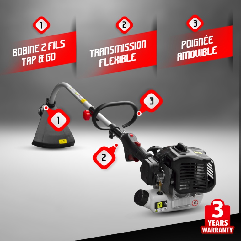 Équipé dun moteur25 CC, il dispose dune surface de travail dune largeur de 380 mm et dun système de coupe «Tap & Go» en cours dutilisation, appuyer sur la tête de lappareil en la cognant au sol afin de faire sortir le fil.