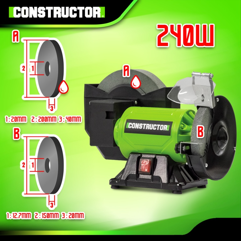 Marque:CONSTRUCTORGarantie:5 ansDescription:Ce touret mixte de la marque Constructor conviendra pour de nombreux travaux de meulage et daffutage, il est équipé de 2 meules - une à eau dun diamètre de 200mmA80 et une à sec dun diamètres de 150mmA36 -A80 pour laffutage des couteaux, ciseaux et A36 pour les gros travauxIl est équipé dun pare étincelles avec effet loupe et dun support de pièces réglables vous assurant une plus grande sécurité de travail.Caractéristiques :- Puissance: 240W- Diamètre de la meule à sec : 150mm- Alésage de la meule à sec : 12.7mm- Epaisseur de la meule à sec : 20mm- Diamètre de la meule à eau : 200mm- Alésage de la meule à eau : 20mm- Epaisseur de la meule à eau : 40mm- Longueur du câble électrique : environ 180cm- Vitesse de rotation de la meule à sec : 2980 t/min- Vitesse de rotation de la meule à eau : 134 t/min- Poids : 9.4kg- Garantie 5 ansCode EAN/GLN:5411074214524Poids:9.00 kg