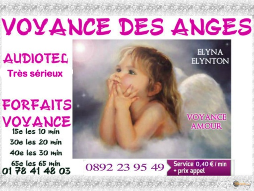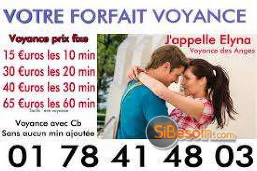 Retrouvez une équipe de voyants, médiums tarologues sur notre salon de voyance réputéVoyance de qualité pour avec des médiums purs, des cartomanciens, une équipe aussi de coachs nous entourent pour vous apporter aide et conseils de vie afin d'améliorer la situation dans laquelle vous vous trouvez et qui vous empoisonne vos journées.Retrouvez le confident(e) qui saura guider votre chemin pour un avenir meilleurVous pouvez nous joindre de 2 façons soit en voyance audiotel sans carte bancaire au 08 92 23 95 49 à 0.40€/minou bien pour une plus grande confidentialité en voyance privée avec nos forfaits voyance à partir de 15€ les 10 minutes, tous nos forfaits sont bloqués pas de surprise...TARIFS SPECIAUX POUR TOUS NOS NOUVEAUX CLIENTS01 78 41 48 03Nos tarifs sont les suivants15 EUROS LES 10 MINUTES20 EUROS LES 20 MINUTES30 EUROS LES 30 MINUTES40 EUROS LES 60 MINUTESLe site de voyance Elyna Elynton est réputé, notre site de voyance est un site privé, nos ne travaillons pas en synergie avec d'autres cabinetnous vous attendons sur notre salon pour une voyance de qualité.Elyna Elyntonhttp://www.voyancepartelephone.fr