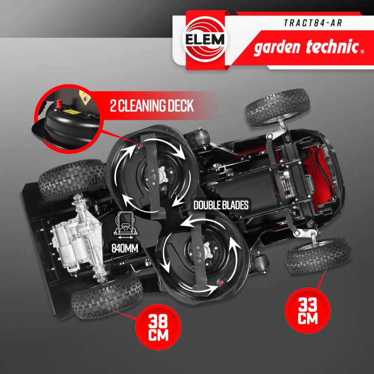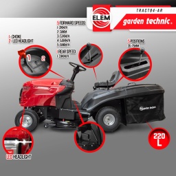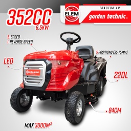 Marque:ELEM Garden TechnicGarantie:3 ansDescription:Le tracteur tondeuse Elem Garden est équipé dun moteur de 352cc / 6.5Kw à 2900t/min et dispose dun bac de ramassage arrière de 220L et dun volant surélevé pour un meilleur confort de conduite.Cette tracteur tondeuse dispose de 5 vitesses avant 2 / 3.4 / 5.1 / 5.6 et 8.4 km/h ainsi que dune vitesse arrière 2.4km/h afin de vous garantir un meilleur contrôle lors de la tonte.Le plateau de coupe de 84cm est équipé de 2 lames et dun réglage de la hauteur de coupe centralisé avec 5 positions de 35 à 75mmCaractéristiques :- Moteur 352CC - 6.5KW- Démarrage électrique batterie 12V 12Ah- Largeur de coupe: 84cm- 5 vitesses avant: 1 2km/h - 2 3.4km/h - 3 5.1km/h - 4 5,6km/h ? 5 8.4km/h- 1 marche arrière: 2,4km/h- Hauteur de coupe centralisée 5 positions: 35-75mm- Diamètre des roues: avant 33cm - arrière 38cm- Bac récolteur 220L- Capacité du réservoir dessence: 5L- Convient pour un terrain de max 3000M²- Pente max : 17%- Nettoyage du carter intégré- Système de suspension pour un renfort de la structure du châssis et un meilleur confort dutilisation- Système déjection arrière intégré dans la structure afin déviter tous bourrages dherbe- Equipé de phares Led- Poids net : 165kgCode EAN/GLN:5411074228439Poids:190.00 kg