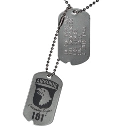 Cette paire de Dog Tag type World War II est composé dune plaque militaire personnalisable par embossage et dune seconde gravée au laser de linsigne de la 101eme Airborne.