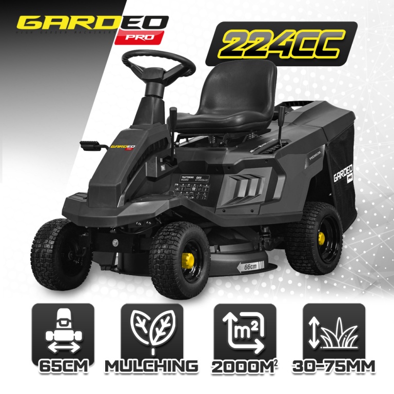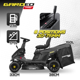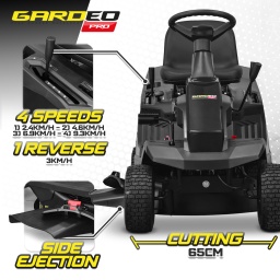 Marque:GARDEO ProGarantie:5 ansDescription:Le rider Gardeo Pro est équipé dun moteur Loncin de 224cc / 4.5Kw et dispose dun bac de ramassage arrière de 150L mais aussi dune éjection latérale.Ce rider équipé dune boîte manuelle dispose de 4 vitesses avant 2.4 / 4.6 / 6.9 et 9.3 km/h ainsi que dune vitesse arrière 3km/h afin de vous garantir un meilleur contrôle lors de la tonte.Le plateau de coupe de 65cm est équipé dune lame et dun réglage de la hauteur de coupe centralisé avec 6 positions de 30 à 75mmLe tracteur dispose dune fonction mulching qui consiste à répandre lherbe coupée sur votre gazon.