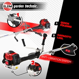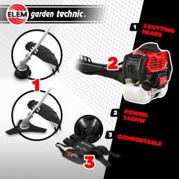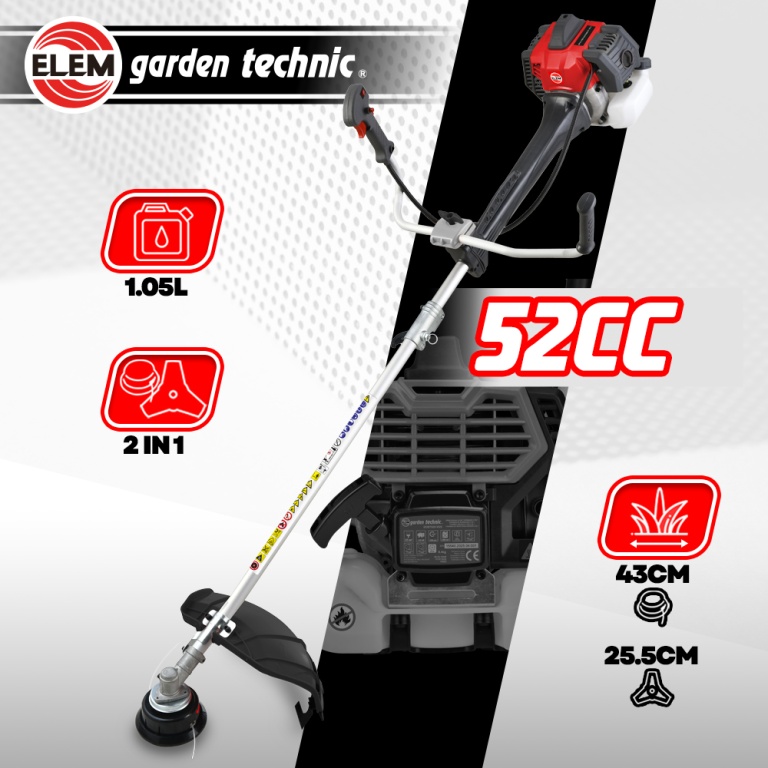 En effet, vous avez le choix entre une bobine dune largeur de coupe de 43 cm et une lame 3 dents dune largeur de 25.5 cm.Cette débroussailleuse thermique est facilement maniable et vous permet datteindre tous les recoins de votre jardin ! Votre travail sera facilité par le système anti vibrations et un harnais double très confortable.Dès le travail terminé, vous pourrez facilement la ranger grâce à son système rapide de pliage du guidonComme tous les produits Elem Garden, cette débroussailleuse a une garantie de 3 ansCaractéristiques :- Cylindrée : 52 CC 2 Stroke - 2 Temps- Puissance : 1,45Kw- Capacité du réservoir : 1,05 L- Largeur de coupe avec la bobine: 43 cm- Longueur du fil : 2.5M- Diamètre du fil : 2.4 mm- Largeur de coupe avec lame 3 dents: 25.5 cm- Type dharnais : Double- 2 en 1 = Lame Bobine- Poids avec réservoir plein : 9.4kg- Carburateur : valve à piston- Méthode dallumage : volant magnétique I-C- Bougie : LD L8RTF / L7RTC- Garantie: 3 ansCode EAN/GLN:5411074243739Poids:9.00 kg