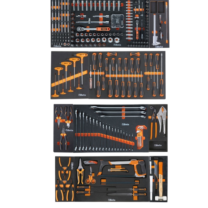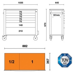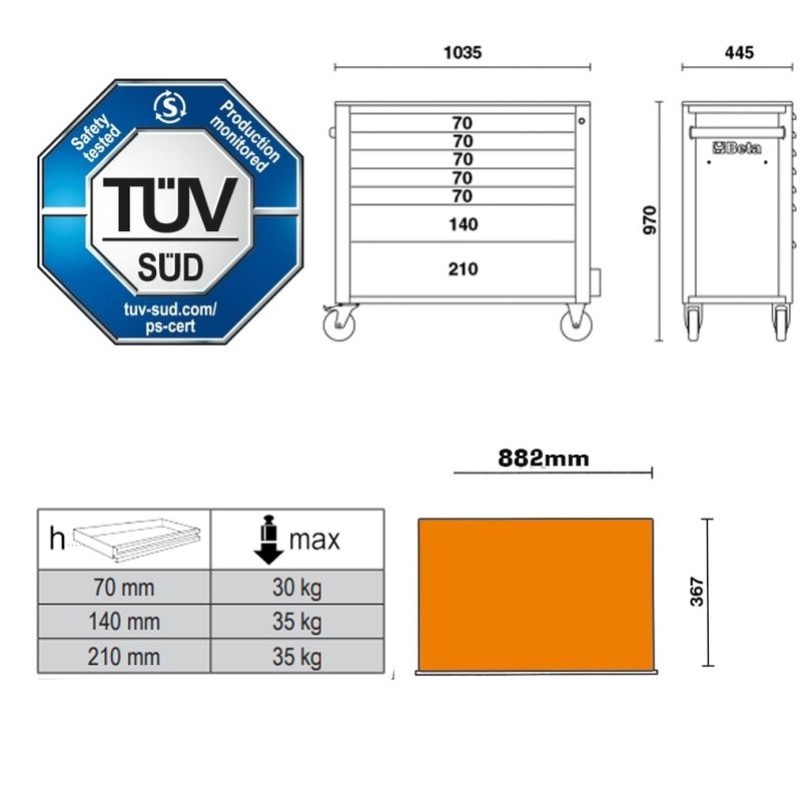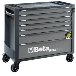 Servante xl Beta avec composition outillage Beta et Beta Worker Servante mobile extra large avec 7 tiroirs, avec système anti-basculement Modèle Extra large avec 7 tiroirs entièrement amovibles 882x367 mm, avec glissières à roulement à billes: - 5 tiroirs, 70 mm de haut - 1 tiroir, 140 mm de haut - 1 tiroir, 210 mm de haut.