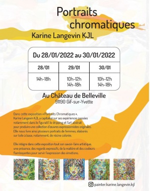 Je suis : un professionnelJe suis : un exposantDate debut evenement : 2022-01-28Date fin evenement : 2022-01-30Localisation : Gif-sur-YvetteExposition au Château de Belleville de l'artiste Karine Langevin KJL à Gif-sur-Yvette (Essonne 91).Dans cette exposition, elle a capitalisé sur ses expériences passées notamment dans le figuratif, le dripping et l'art abstrait pour produire une collection d'oeuvres expressionnistes originales.