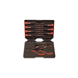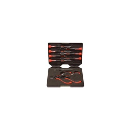Coffret de pinces 3 pièces et tournevis électronique 7 pièces- poignée ergonomique bicomposant- ouverture automatique pour un meilleur confort d'utilisation- chrome vanadium- tournevis à tête pivotante pour plus de confort et précision- pointe en acier s2 ultra résistant pour plus de longevitecomposition tournevis:- 1 tournevis ph00x2 50mm - 1 tournevis ph0x2.4 50mm - 1 tournevis ph1x3.5 50mm - 4 tournevis plats 1.4 à 3 50mm composition pinces:- 1 Pince à bec demi-rond droit 130mm - 1 pince coupante diagonale 120mm - 1 pince bruxelle inox 145mm
