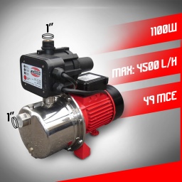 Marque:MASTER PUMPSGarantie:3 ansDescription:Ce groupe hydrophore multi cellulaire auto amorçant avec corps en inox de la marque Master Pumps est idéal pour alimenter votre logement salle de bain, machine à laver, WC, robinet extérieur…… Il dispose d’une puissance de 1100 W, est capable d’aspirer de l’eau à une profondeur qui ne dépasse pas 8 mètres et possède une hauteur maximum de refoulement de 49 MCE.Ce groupe hydrophore est équipé d’un système électronique permettant à la pompe de s’arrêter en cas de manque d’eau dans votre citerne mais aussi d’assurer une pression constante dans toute votre installation.Son fonctionnement est silencieux grâce à ses 4 turbines.Caractéristiques :- Puissance: 1100 W- Débit max: 4500 L/H- Hauteur max de refoulement: 49 MCE- Hauteur max daspiration: 8 M- Exécution: inox- Turbine: 4x PPO- Diamètre daspiration: 1 femelle- Diamètre de refoulement: 1 mâle- Système électronique = Sécurité manque deau pression constante.- Pas dentretien- Pompe compacte, gain de placeCode EAN/GLN:5411074113674Poids:11.50 kg