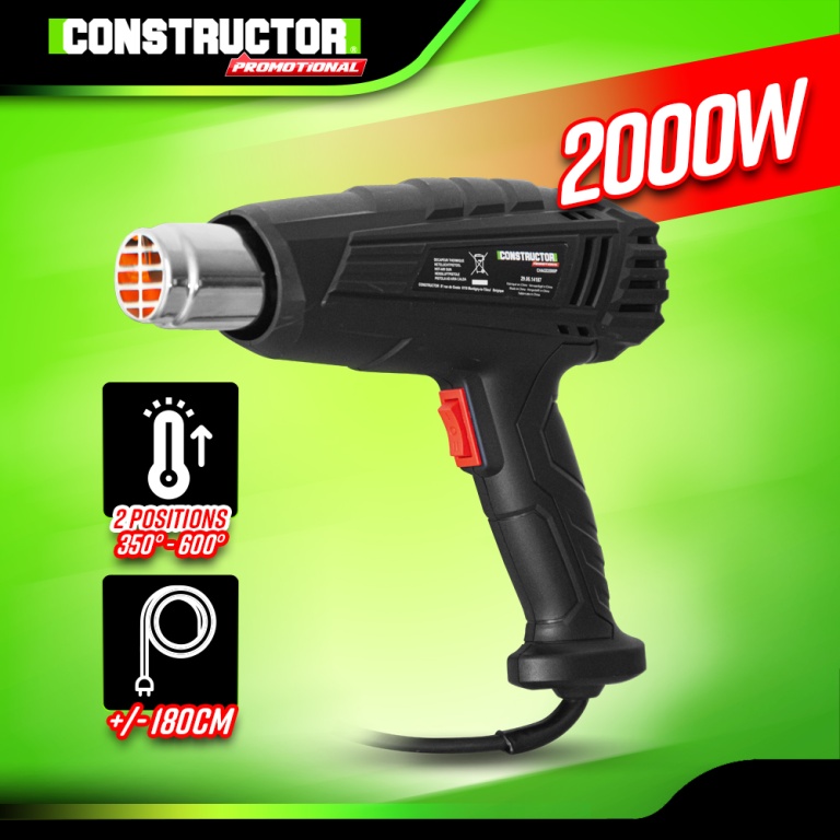 Marque:CONSTRUCTOR PROMOTIONALGarantie:2 ansDescription:Grâce à ce décapeur thermique de la marque Constructor Promotional, vous pourrez facilement décoller des autocollants, appliquer des gaines thermo rétractables, enlever de vieilles peintures, plier des tuyaux plastiques...Selon le travail à effectuer, vous pourrez sélectionner 2 positions de chauffe : 350 ou 600°Caractéristiques :- Puissance: 2000W- Tension : 230-240V- Fréquence : 50Hz- 2 positions de chauffe : 350°-300L/min - 600°-500L/min- Longueur du câble électrique : environ 1.8M- Poids net : 580 grCode EAN/GLN:5411074231620Poids:0.70 kg