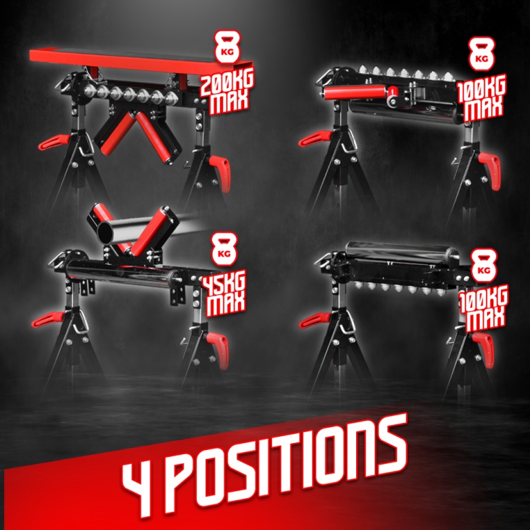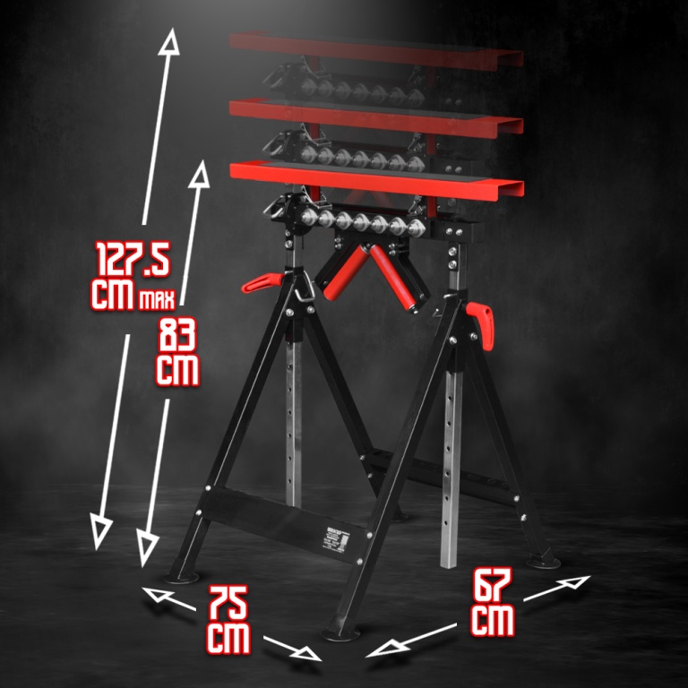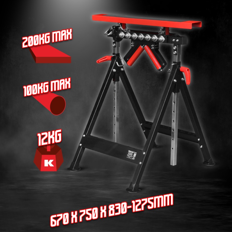 De plus, ce tréteau se déplace et se range facilement.Caractéristiques :- Dimensions : 75 x 63,5 x 83-127.5 cm- Charge max :- sur la plateforme : 200kg- sur le V: 45kg- sur rouleau: 100kg- sur roulement à billes: 100 kg- 4 positions : plateforme - rouleau - rouleaux en V - roulement à billes- Hauteur réglable: de 83 à 127.5 cm- Livré en boite couleurCode EAN/GLN:5411074164867Poids:11.60 kg