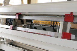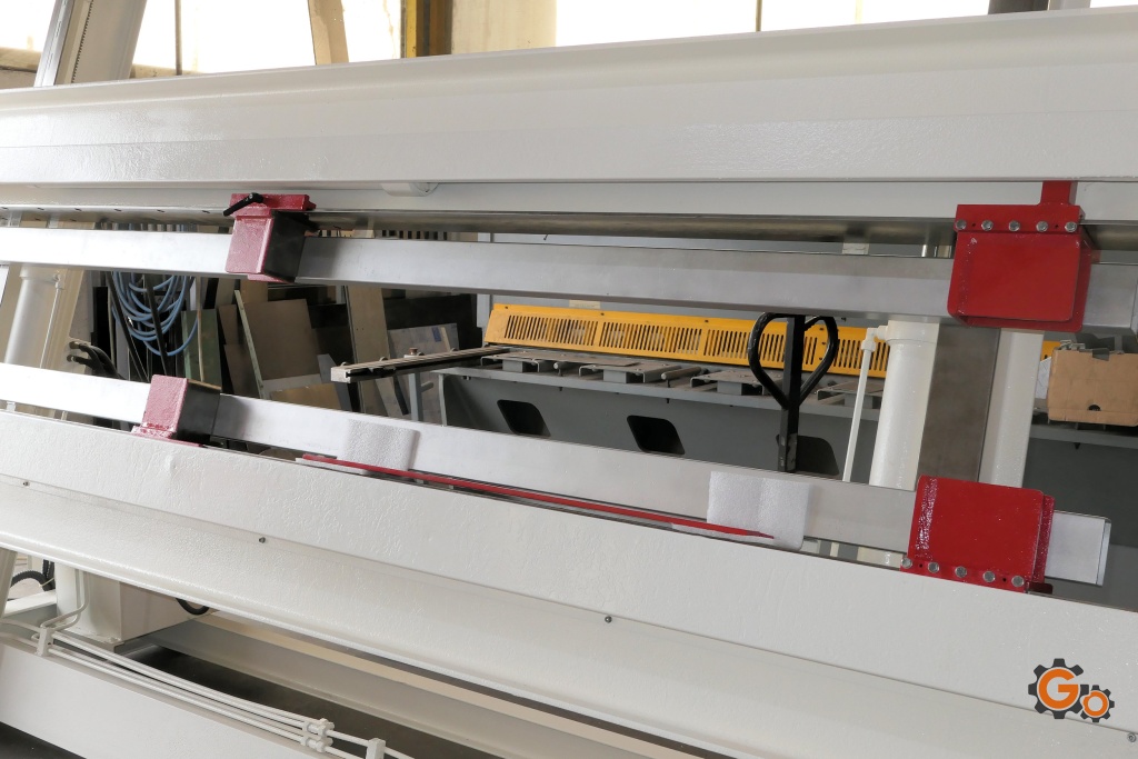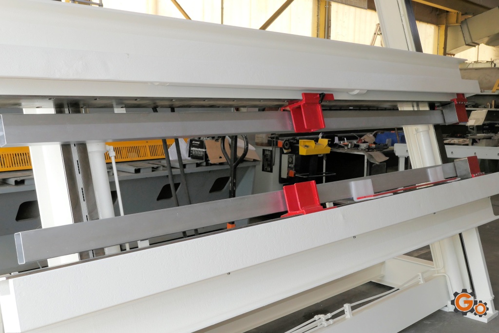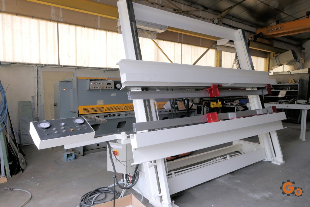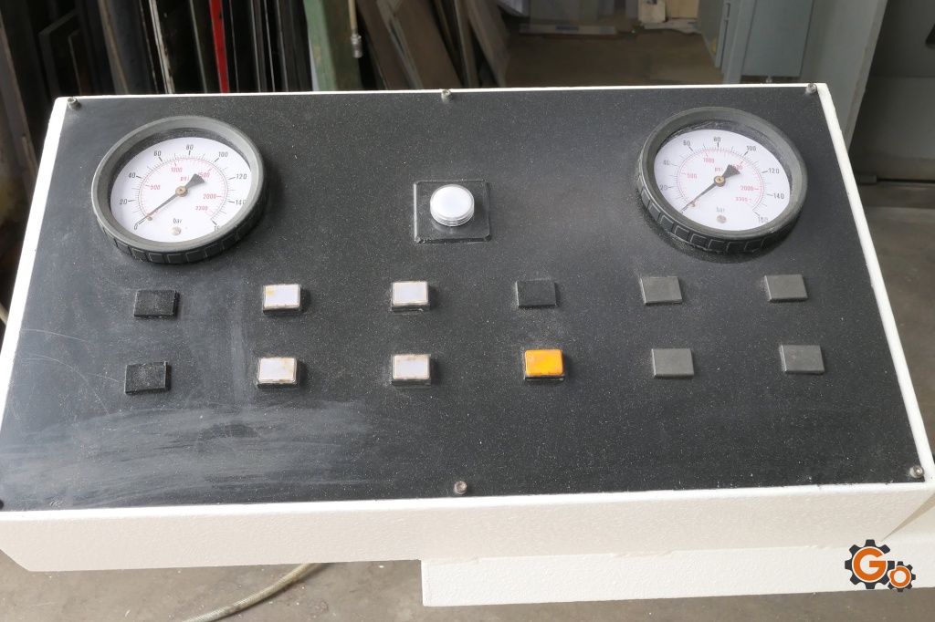 Capacité: 3000 X 2000 mmMoteur 1,5 kW2 vérins verticaux pour le mouvement de la poutre supérieure, poutre inférieure positionnable,2 vérins horizontaux pour les sabots mobiles, les 2 autres sont positionnables manuellement sur les poutres.Commandes électriques des différents mouvements.