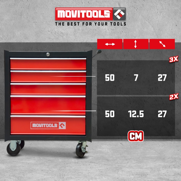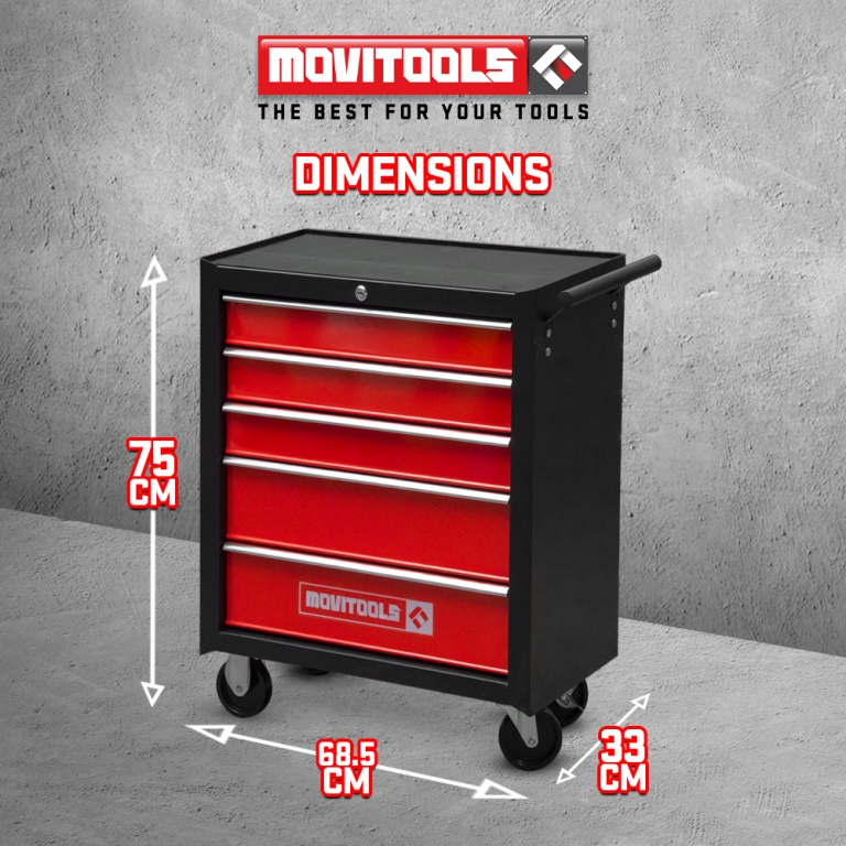 Marque:MOVITOOLSGarantie:3 ansDescription:Mettez de lordre dans votre atelier et retrouvez facilement vos outils grâce à cette servante 5 tiroirs ! De la marque Movitools, cette servante peut supporter une charge maximum allant jusquà 150 kg et dispose de 5 tiroirs à roulement à billes avec mousse anti dérapante.La servante RC5T-S dispose de 2 roues fixes et de 2 roues mobiles avec frein pour éviter que le chariot se déplace accidentellement lors de vos travaux.Pour faciliter vos déplacements, elle est équipée dune poignée.Caractéristiques :- Dimensions: 685 x 330 x 750 mm- 5 tiroirs avec roulement à billes- Dimensions des tiroirs :- 3 tiroirs de 50 x 27 x 7cm- 2 tiroirs de 50 x 27 x 12.5xm- Anti dérapant dans les tiroirs- Anti dérapant sur la partie supérieure- Équipé dune poignée pour faciliter le déplacement- Équipé de 2 roues fixes et 2 mobiles avec frein- Charge max: 150kg- Acier renforcé- Couleur époxy, antirouille- Garantie 3 ansCode EAN/GLN:5411074214838Poids:22.50 kg