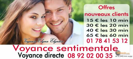 cabinetvoyance des anges elyna elyntonrejoignez notre équipe de voyants, des clients satisfait à 98% et quinous font confiance et nous sont fidèles depuis plus de 15 ans.voyance en directe sans carte bancaire08 92 23 95 49 à 0.40eur/mindes consultations de haute qualitéforfaits voyance prix fixevoyance avec tarif spéciales nouveaux clients en voyance privéecb 01 78 41 48 0315eur les 10 min30eur les 20 min40eur les 40 min65eur les 60 minnotre site : http://www.voyance-des-anges.comvous pouvez rejoindre notre site pour tous nos tirages gratuit en lignetirage du tarot gratuit icioracle de l'amour gratuit icilouna kiss meilleure mediumvoyance paypalnos voyantes
