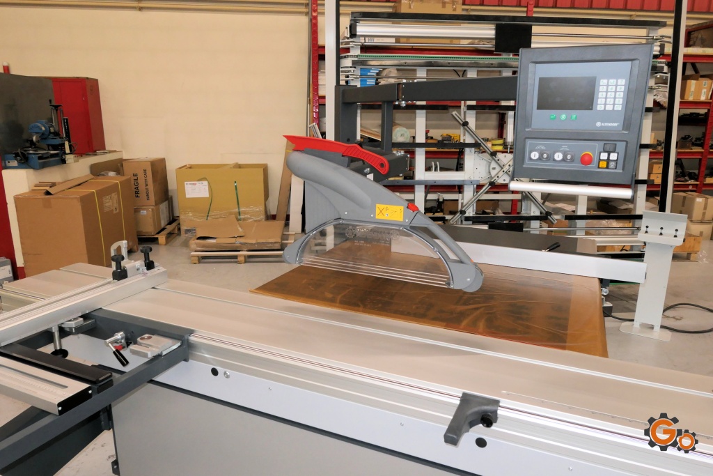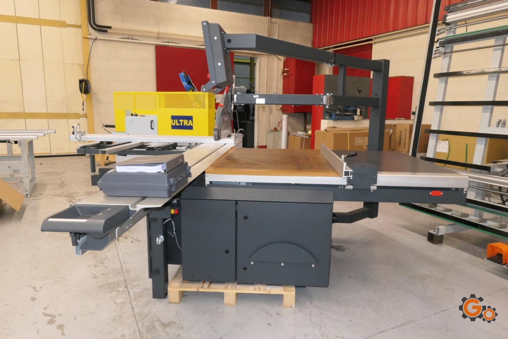 Pupitre suspendu avec commande EvoDrive3 axes numérisés:Réglage numérisé de l’inclinaison de 0 à 46°Réglage numérisé de la hauteur avec correction automatique lors de l’inclinaisonDéplacement numérisé du guide parallèle 1300 mmInciseur, à réglage électrique2-axes avec lame de type Rapido largeur ajustable sans démontageTémoin LED sur la table pour linciseurGuide déquerre, orientable 3500 mmDuplex 1350 mmCommandes marche/arrêt sur pupitre et en bout de chariotChariot 3200 mm,