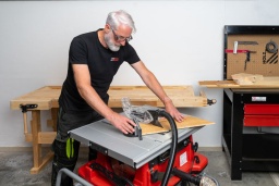 Scie circulaire équipé avec un puissant moteur de 2000w et 4800 tr/min.Lame inclinable 0º -45º de 254 mm avec une capacité de coupe de 80 mm à 90º.Table aluminium 940 x 642 mm.Hauteur et inclinaison de la lame par volant.Buse d´aspiration de Ø 40Garantie 2ansLivrée avec:Lame Ø 254 mm, 60 dents, guide d´angle, poussoir de sécurité et guide parallèle avec loupe, capot protecteur avec flexible d’aspiration.Socle roulant en optionDonnées sur les moteursPuissance moteur S1 W1800Voltage230V 50HzVitesse rotation arbre min-14800Puissance moteur S6 W2200 S6 20%Classe de protectionIIdimensionsDimensions table mm675-1040 x 560Buse d´aspiration40Hauteur table mm310Dimensions machine mm675-1040 x 750 x 460capacité de coupeProfondeur de coupe maxi 90° mm80Profondeur de coupe maxi 45°mm50Capacité coupe lame a guidemax.