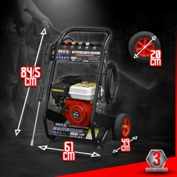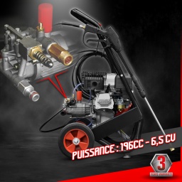 et le noir avec un angle de dispersion de 84° convient pour appliquer des produits chimiques ou des solutions de nettoyage, il a la pression la moins puissante.Ce nettoyeur est équipé dun moteur de 196cc 6.5Hp / 3.65Kw, il vous fournira une pression max de 210 bars et un débit max de 9.5 L/min.Transportez facilement votre nettoyeur haute pression grâce à sesroueset sapoignée de transport.Avant utilisation, pensez à faire le niveau dhuile SAE10W-30, le plein dessence sans plomb et de remplacer le bouchon de transport de la pompe blanc par le bouchon de service qui est livré avec les accessoires rouge avec un petit trou de dépression.Equipé dune sécurité manque dhuile pour la protection du moteur.Ce produit est garanti 3 ans.Caractéristiques:- Cylindrée : 196cc- Puissance moteur: 6.5Hp / 3.65Kw- Pression max : 210 bars- Débit max : 9.5 L/min- Pompe à soupapes en tête- Réservoir essence sans plomb : 3.6L- Réservoir dhuile SAE10W-30 : 0.6L- Accessoires : flexible haute pression 8M, un pistolet, une lance 5 gicleurs, 1 flexible daspiration de détergent.- Température max de leau : 50°- Démarrage manuel- Garantie 3 ansCode EAN/GLN:5411074209339Poids:29.00 kg