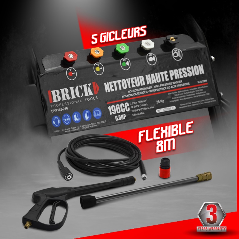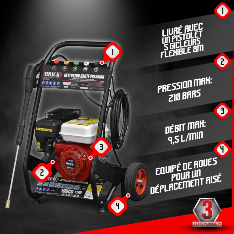 Marque:BRICKGarantie:3 ansDescription:Lenettoyeur haute pression thermiquede la marque Brick est loutil parfait pour nettoyer facilement vos véhicules, terrasses, façades...Il est équipé de 5 gicleurs : le rouge avec un angle de dispersion de 0° qui est adapté pour les travaux les plus lourds enlever de la peinture, nettoyage des roues dun tracteur...