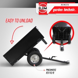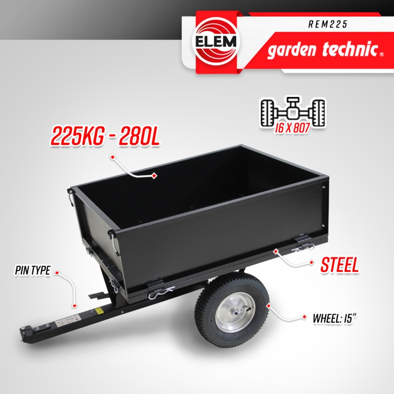 Marque:ELEM Garden TechnicGarantie:3 ansDescription:Cette remorque pour tracteur tondeuse a une capacité de charge max de 225kg, elle vous permettra de transporter des feuilles, de la terre, du compost, de la paille, du bois de chauffage…Elle est équipée dune benne basculante pour faciliter le déchargement.Caractéristiques :- Charge max : 225kg – 280L- Matériau de la benne et du chassis : acier- Dimensions intérieure de la benne : 975x720x310mm- Dimensions hors tout : 1480x775x765mm- Dimensions de lessieu : 16x807mm- Poids net : 33.7kg- Poids brut : 36.7kg- Coloris : noir- A monter soi même.Code EAN/GLN:5411074244743Poids:36.70 kg