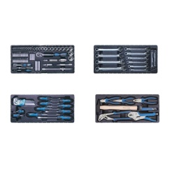 Composition : - 14 douilles 1/2" : 14-15-16-17-18-19-20-21-22-23-24-27-30-32mm- 2 douilles longues 1/2" : 17-19mm- 2 douilles à bougie : 16-21mm- 1 rallonge 1/2" 125mm- 1 rallonge 1/2" 250mm- 1 adaptateur 3/8"Fx1/2"M- 1 cardan universel- 1 clé à cliquet 1/2" 72 dents- 1 tournevis porte douille 150mm- 12 douilles 1/4" : 4-4,5-5-5,5-6-7-8-9-10-11-12-13mm- 3 douilles longues 1/4" : 8-10-13mm- 1 cardan 1/4"- 1 clé à cliquet 1/4" 72 dents- 1 rallonge 1/4"- 1 poignée coulissante 1/4"- 22 embouts 1/4" :PH1-2-3 - PZ1-2-3 -HEX 2-3-4-5-6-8 mmPlat 3-4-5-6mmTorx T10-15-20-25-30-40- 12 clés mixtes : 8-9-10-11-12-13-14-15-16-17-18-19mm- 10 tournevis : 6x38-5x75-6x100-8x150mm PH2x38-PH1x75-PH2x100-PH3x150mm PZ1x75-PZ2x100- 6 clés Torx® : T10-15-20-25-27-30- 9 clés Hex : 1,5-2-2,5-3-4-5-5,5-6-8-10mm- 1 marteau menuisier 25mm- 1 pince multiprise entrepassée 245mm- 1 pince étau 250mm- 1 pince bec long 150mm- 1 pince universelle 175mm- 1 pince coupante de côté 150mm2 poignées latérales de transport.