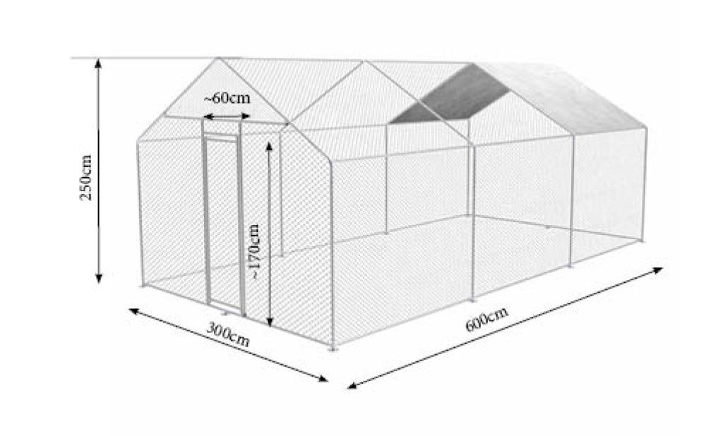 Parc grillagé robuste qui protège les petits ani-maux des prédateursDimensions : 3m x 6m x 2,5mSurface : 18m2Structure grillagée : métal galvanisé revêtu de PVC.Mailles : 45x25Avec 1 porteBâche anti-UV et imperméableDimensions tubes ø25x0.65mmDispose d’un grand espace permettant aux ani-maux de se mouvoir facilementDoté d’une bâche qui offre une partie ombragée et une protection contre les intempéries.Convient pour de petits animaux : poules, lapinsdimensionsDimensions machine mm3m x 6m x 2,5mPoidsPoids brut kg58.50Poids net kg54emballageLargeur emballage mm280Longueur emballage mm1.900Hauteur emballage mm170Information généraleCode EAN9120039233888