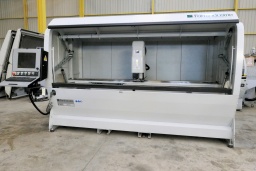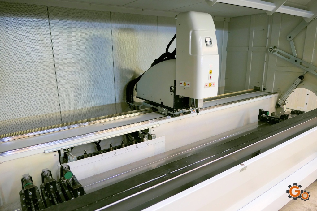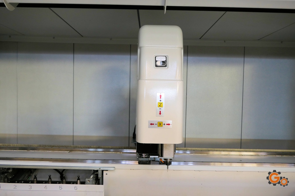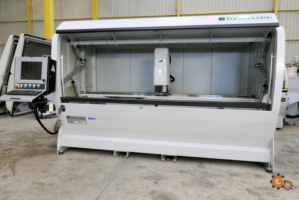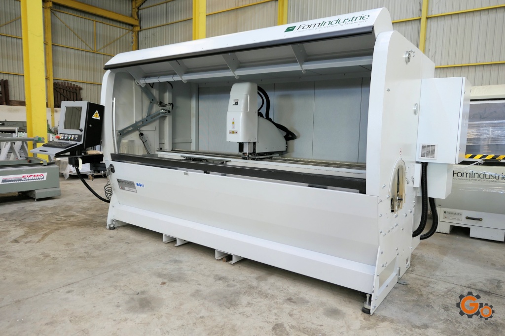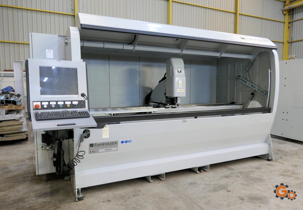 Centre d’usinage à 3 axes contrôlésPlan de travail à rotation pneumatique 0°/90°/180°,Moteur broche triphasé 3 kW servo ventilé,Vitesse variable de la broche par variateur 1000/12000 t/minBroche-cône ISO 30, Magasin outils à 6 places ISO 30,Déplacement automatique des 4 étaux,Butées pneumatiques de référence du profilé sur les côtés gauche et droit du plan de travail,Carénage périmétral avec ouverture porte verticale pneumatique,Pupitre de commande avec PC, clavier et souris,Licence d’utilisation du programme FOM CAMModule d’importation des DXFAnnée 2012