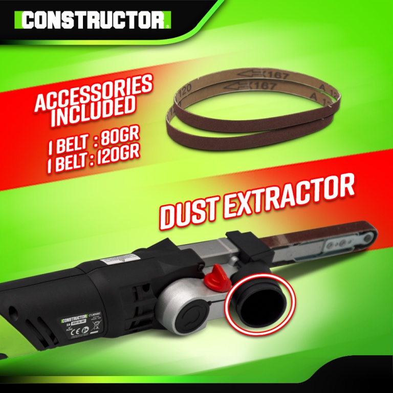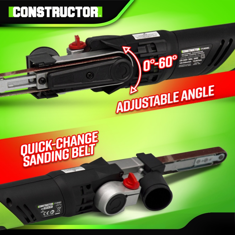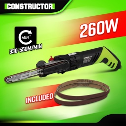 Marque:CONSTRUCTORGarantie:5 ansDescription:Cette lime électrique Constructor est équipée dun bras orientable à 60° ce qui vous permet une manipulation aisée et un travail précis même dans des endroits moins accessibles.Cette machine est équipée dun systême de changement rapide de la bande abrasive, dune vitesse variable qui vous permettra de vous adapter au matériau à travailler et dun adaptateur pour lextraction des poussières.Elle est idéale pour poncer, polir, ébarber...Caractéristiques :- Puissance : 260W- Vitesse variable : 330 à 550 M/min- Longueur du bras de la lime : 130mm- Dimensions de la bande abrasive : 13 x 457mm- Dimensions de lappareil : 44x9.5x8.5cm- Poignée softgrip- Livrée avec 2 bandes abrasives : 1 grain 120 et 1 grain 80Code EAN/GLN:5411074213138Poids:2.50 kg
