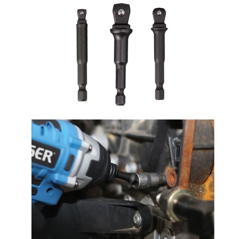 Un jeu de 3 rallonges avec débattement pour entraîner des douilles à carré de 1/4", 3/8" et 1/2" avec capacité de mandrin rapide.