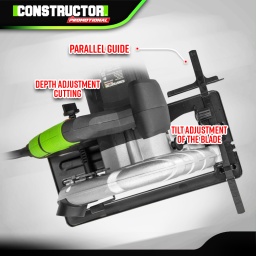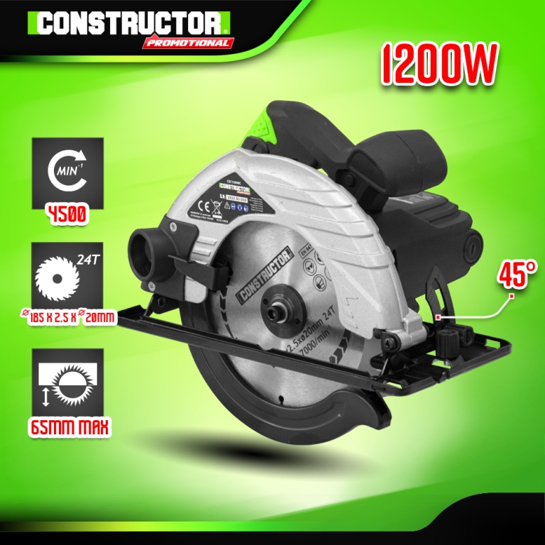 arque: CONSTRUCTORGarantie:2 ansDescription:Cette scie circulaire de la marque Constructor promotional est idéale pour les coupes droites ou inclinées dans le bois.Réglage aisé de la profondeur de coupe max 65mm grâce à la graduation.Système de poignée à 2 mains pour une plus grande sécurité de travail.Inclinaison de la lame jusquà 45°.Caractéristiques :- Puissance: 1200W- Tension : 230-240V- Fréquence : 50Hz- Vitesse à vide : 4500t/min- Lame 24 dents dun diamètre de 185mm et alésage de 20mm- Inclinaison de la lame à 45°- Poignée soft grip- Profondeur de coupe : max à 90° 65 mm et max à 45° 45mm- Poids : 3.4kg- Livré avec un guide parallèleCode EAN/GLN:5411074215514Poids:4.50 kg