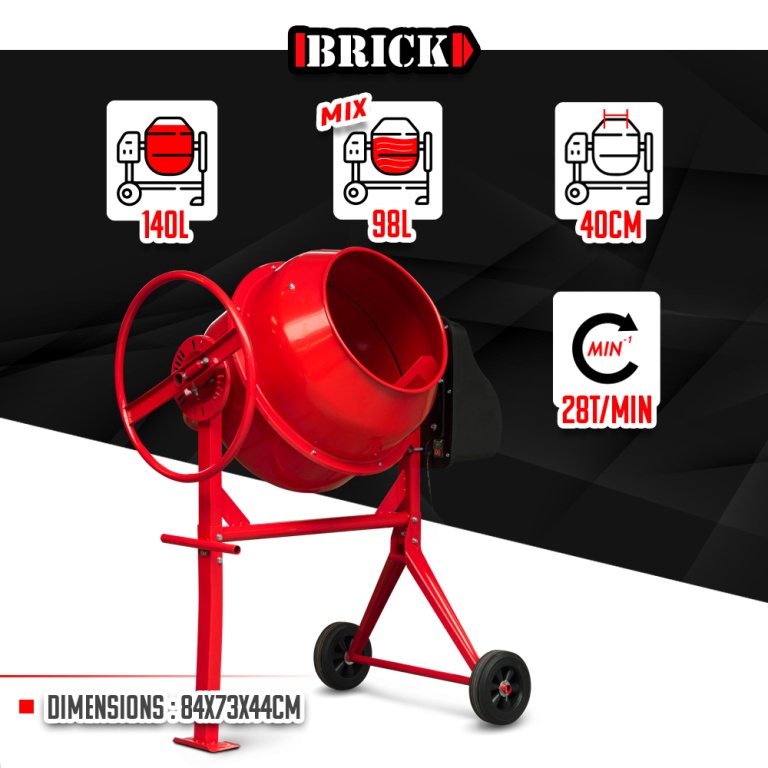Marque:BRICKGarantie:3 ansDescription:Cette bétonnière 550W de la marque Brick vous fera gagner du temps et de lénergie pour tous vos travaux de rénovation ou de construction aussi bien à domicile que sur chantier.Elle est équipée dun cadre en acier renforcé et de 2 roues fixes vous assurant une excellente stabilité et grande facilité de déplacement.Langle du tambour est facilement ajustable grâce au grand volant à main.Caractéristiques :- Capacité du tambour : 140 L- Capacité de malaxage : 98 L- Diamètre de louverture : 400mm- Puissance : 550W- Tension : 230V - 50Hz- Nombre de tours/min : 28- Dimensions : 84x73x44cm- Poids : 52.5kg- Double isolation- Indice de protection IP44- Diamètre des roues 23cm- Couronne et pignon dentraînement en métalCode EAN/GLN:5411074216160Poids:54.00 kg