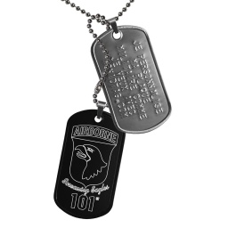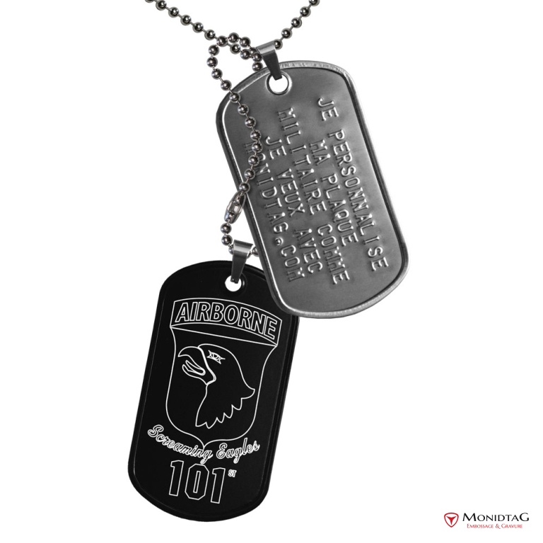 La plupart du temps, linsigne de la 101eme Airborne se porte comme un hommage ou le témoignage dune reconnaissance.Cet ID Tag est composé de 2 plaques militaires en acier à bords retournés et montées sur bélières.